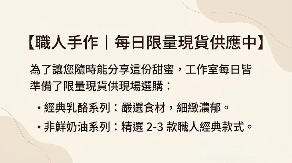 *我們的產品堅持不添加乳化劑、保溼劑,為保有最佳香氣和口感,蛋糕建議當日食用完畢。