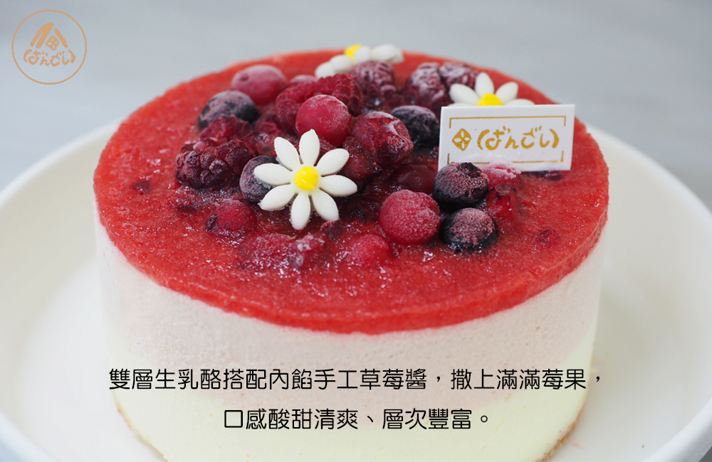 上層草莓生乳酪,搭配下層生乳酪,雙層生乳酪夾餡手工草莓醬,撒上滿滿莓果,微冰凍後的口感酸甜清爽、層次豐富,吃多了也不膩 !