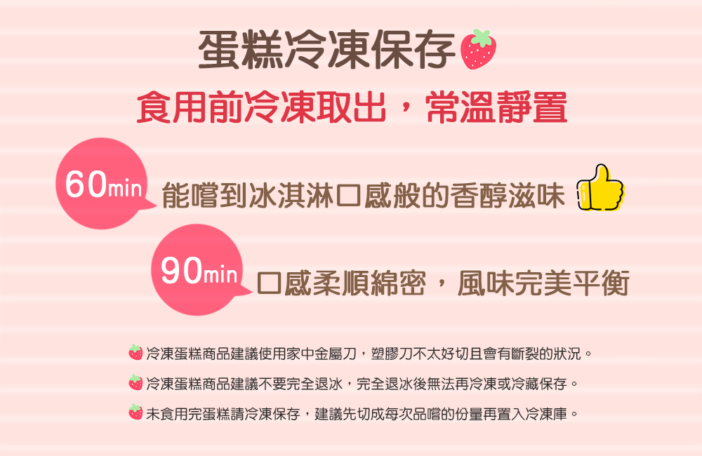 3.產品食用依照蛋糕尺吋,保存和退冰時間皆有不同,欲知詳情請參閱→【食用與保存問題】