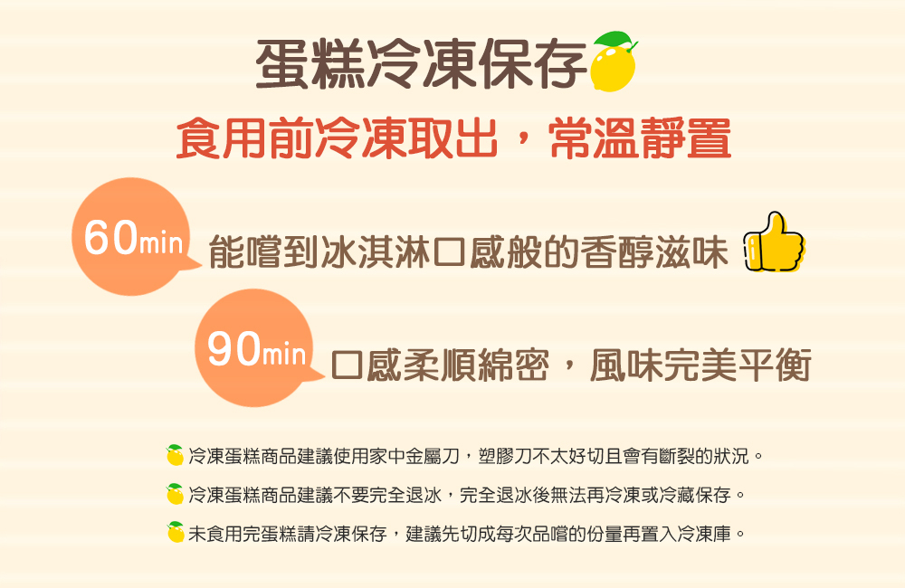 3.產品食用依照蛋糕尺吋,保存和退冰時間皆有不同,欲知詳情請參閱→【食用與保存問題】