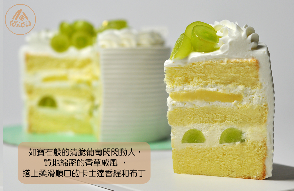 嚴選進口無籽綠葡萄,清爽脆甜多汁,質地綿密的香草戚風 ,搭上柔滑順口的卡士達香緹和布丁,是一款令人垂涎欲滴的清新甜點。