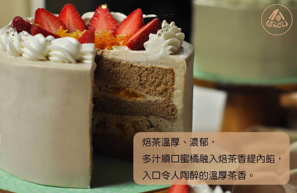嚴選日本產茶大縣的靜岡焙茶,使戚風蛋糕中多了溫厚濃郁的焙炭風味 多汁順口蜜橘融入焙茶香緹內餡,為炭培氣息點綴上一些清新,不苦不澀,入口令人陶醉的滿滿茶香,充分展現焙茶系甜點的魅力。