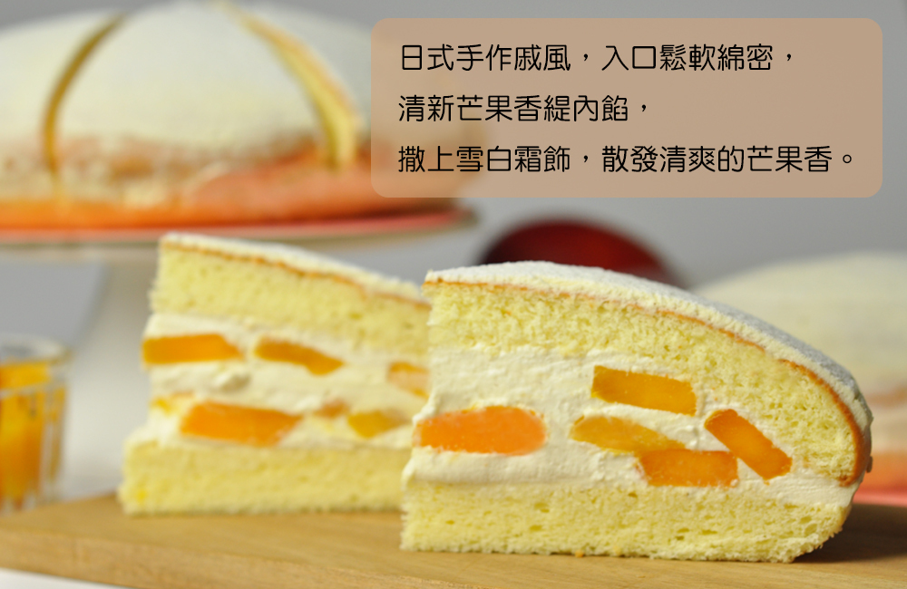 當季在地新鮮芒果,香草戚風蛋糕,搭配香滑順口的鮮奶油內餡,撒上的雪白霜飾,香甜芒果香氣融合口中,散發溫潤自然清爽的淡淡乳香,絕佳口感。
