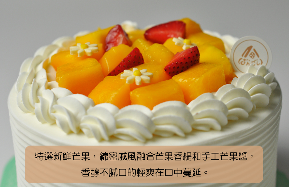 特選新鮮芒果為內餡,融合香濃不膩口的芒果香緹鮮奶油,手工芒果醬,搭配口感綿密的香草戚風,是一款充滿夏日清新風味的蛋糕。