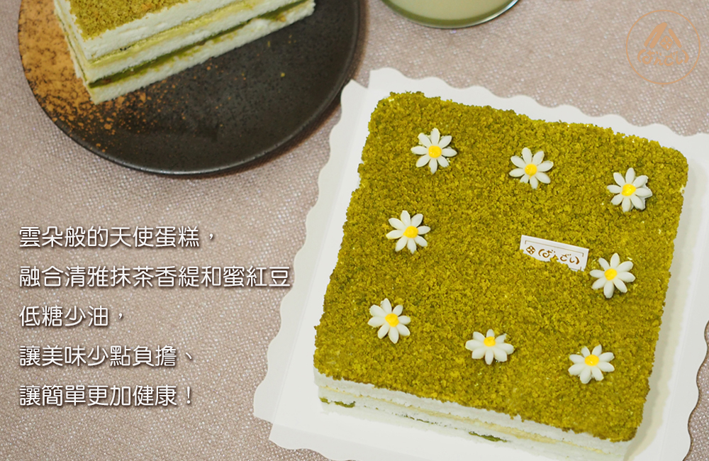 雲朵般的天使蛋糕,融合清雅抹茶香緹和蜜紅豆。低糖少油 、讓簡單更加健康,美味少點負擔。